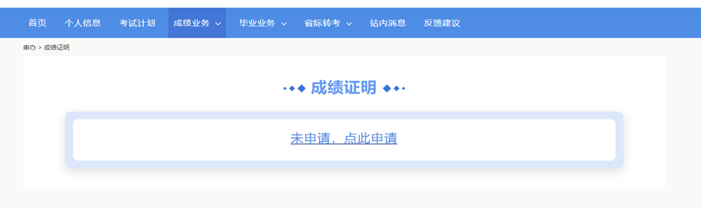 凡参加上海市高等教育自学考试,已取得一门及以上合格成绩且未毕业的考生,可以登录“考生服务平台”(https://ste.shmeea.edu.cn/login.html),点击顶部菜单【成绩业务】栏下的【成绩证明】栏目,点击页面中“未申请,点此申请”链接(如下图所示)进入申请成绩证明页面。