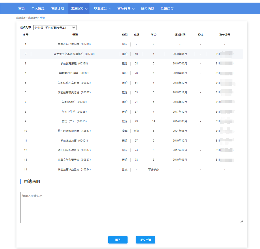 成绩证明申请页面:显示考生所选择的专业和该专业所有的合格成绩,并填写申请说明,如下图所示: