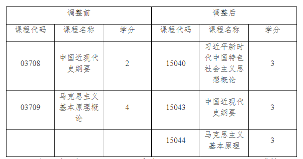 一、调整后高等教育自学考试本专科层次专业的思想政治理论课均设置3门课程,共9学分,调整前后的变化如表所示。